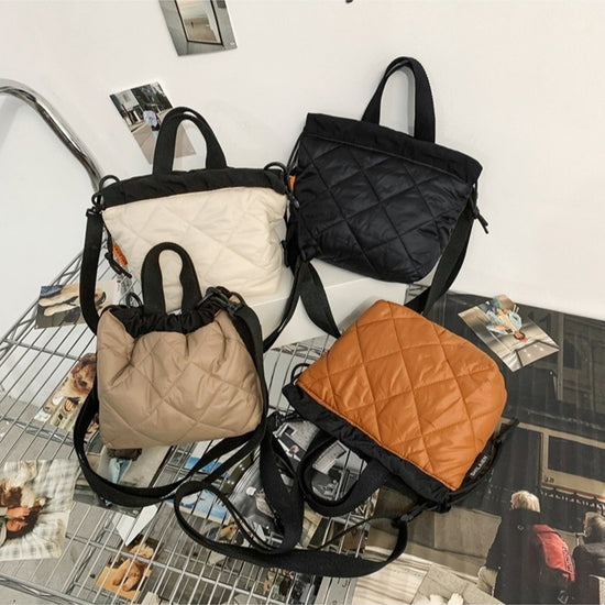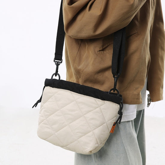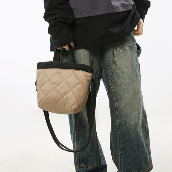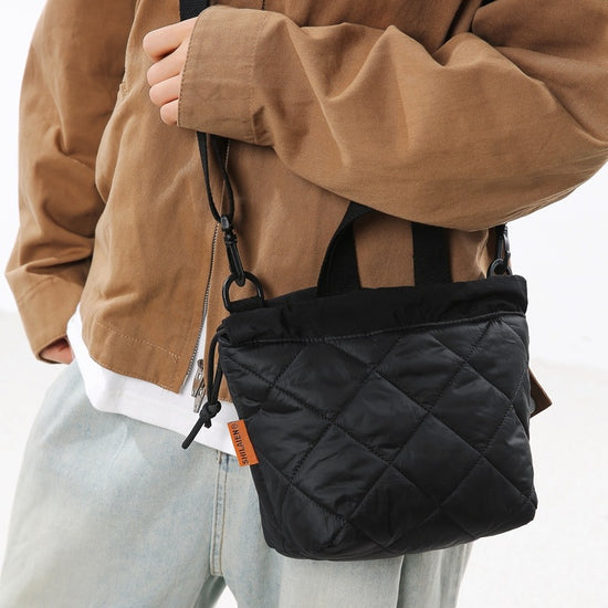 致青春|高級感秋冬新款斜背包加厚菱格繡線肩背包通勤休閒抽繩水桶手機包「285-118」25.11-3