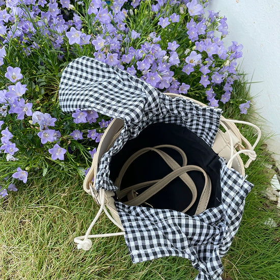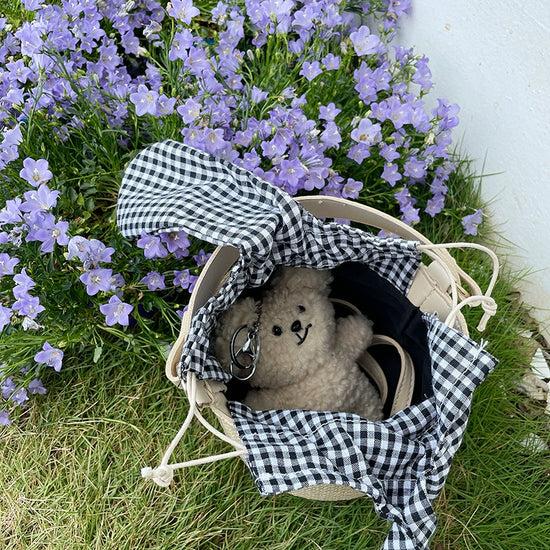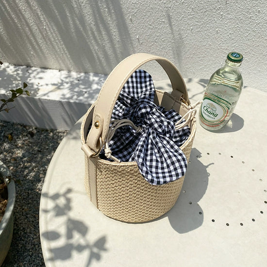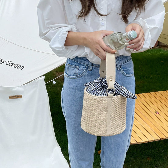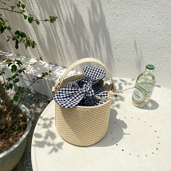 日韓流行|蝴蝶結格子水桶草編包女2024新款時尚百搭單肩斜挎洋氣編織手提包「8662#」24.03-4