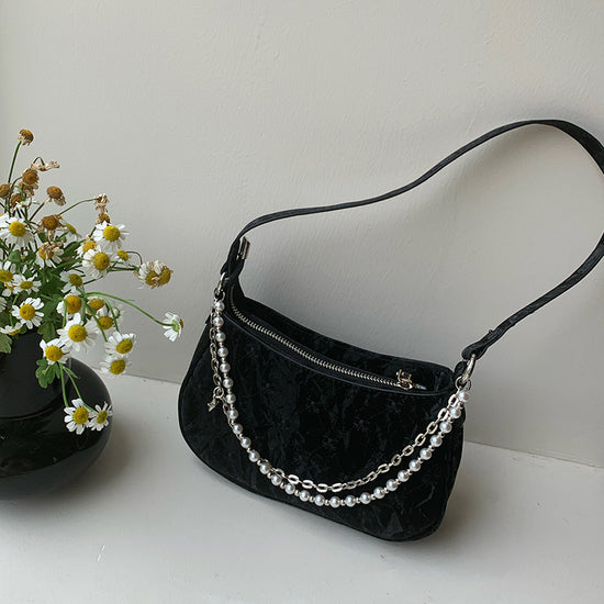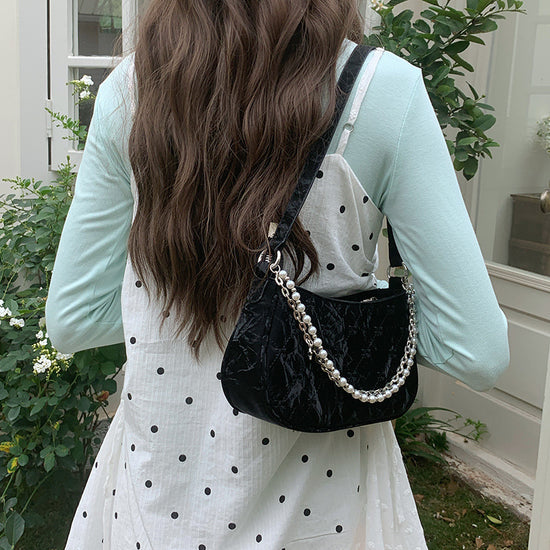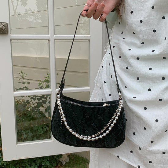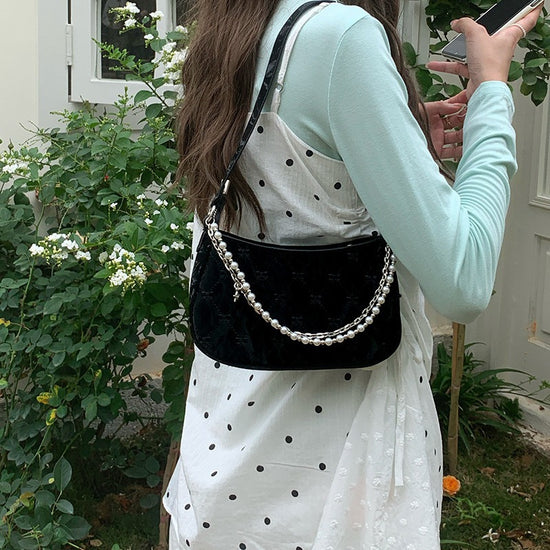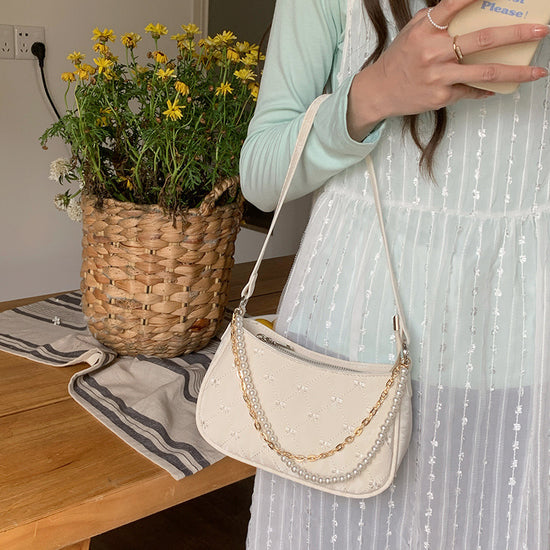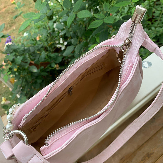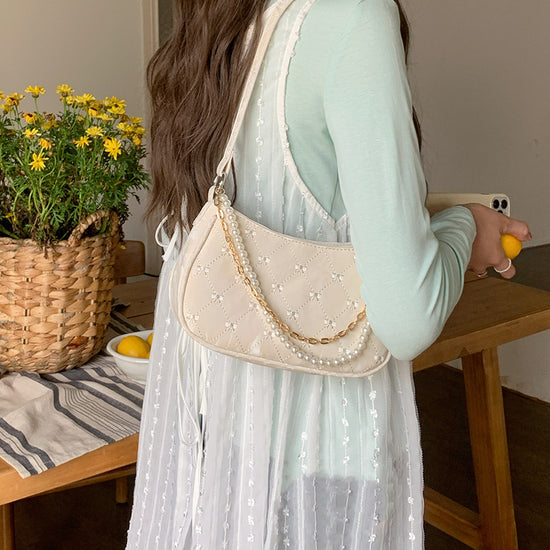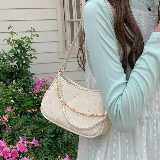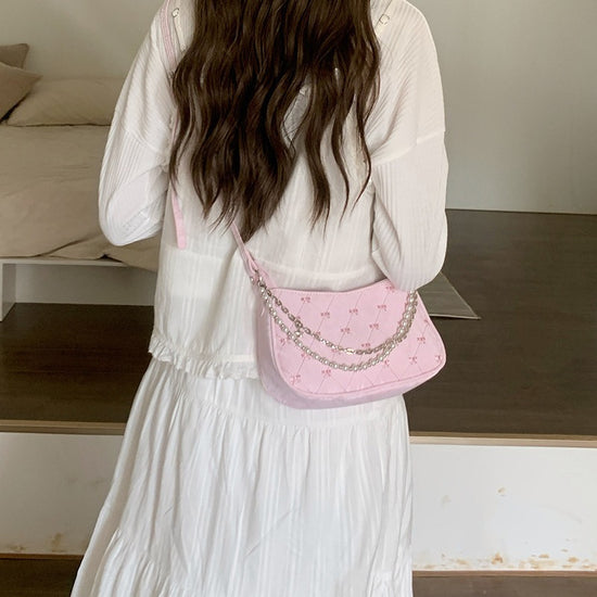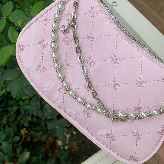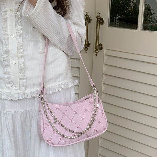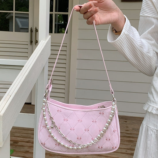 日韓流行|粉紅蝴蝶法國包女2024新款珍珠金屬鏈菱格腋下包蝴蝶結刺繡休閒單肩斜背包「9332#」24.04-3