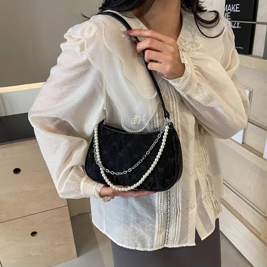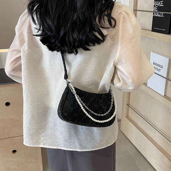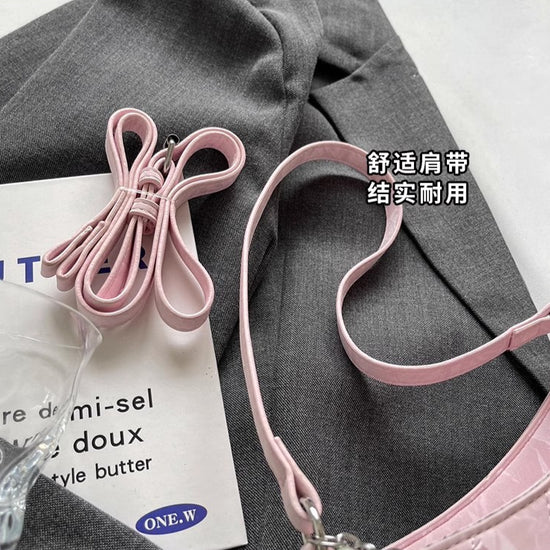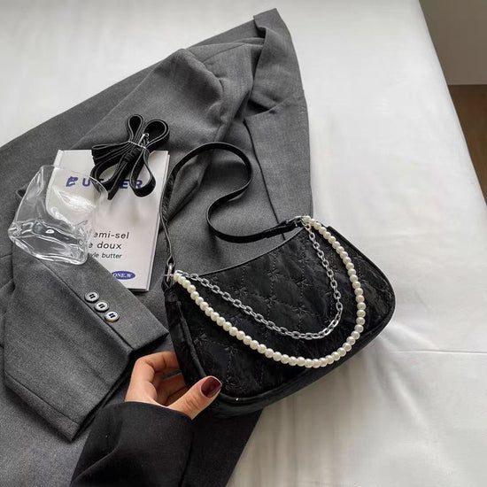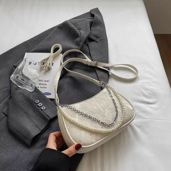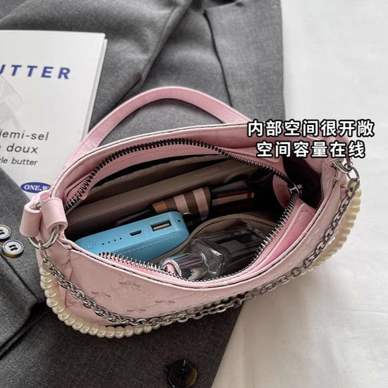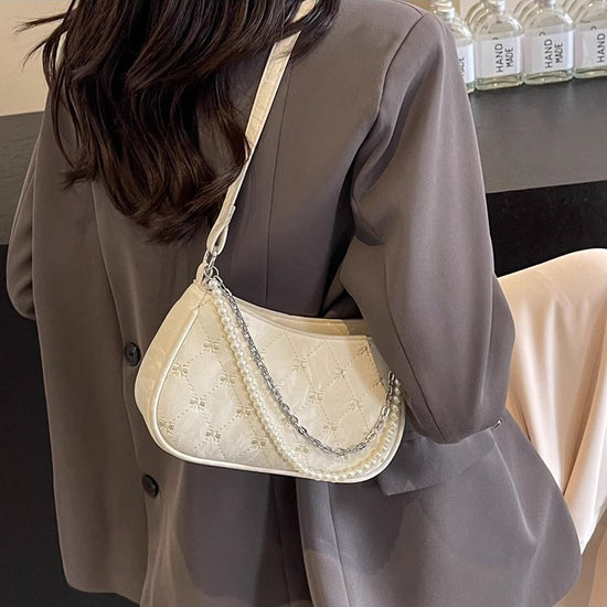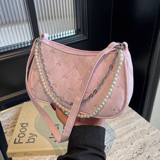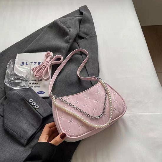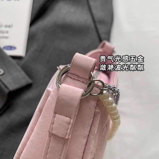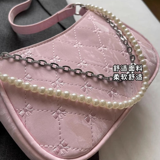 日韓流行|粉紅蝴蝶法國包女2025新款珍珠金屬鏈菱格腋下包休閒單肩斜背包「9332#」25.04-3