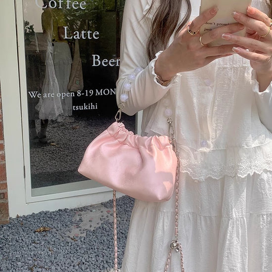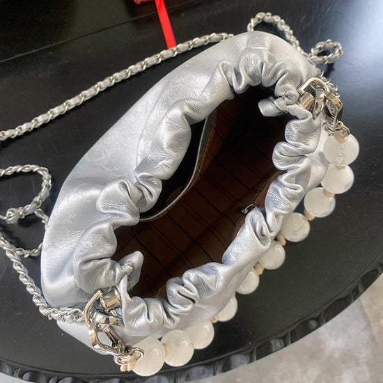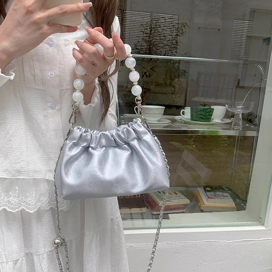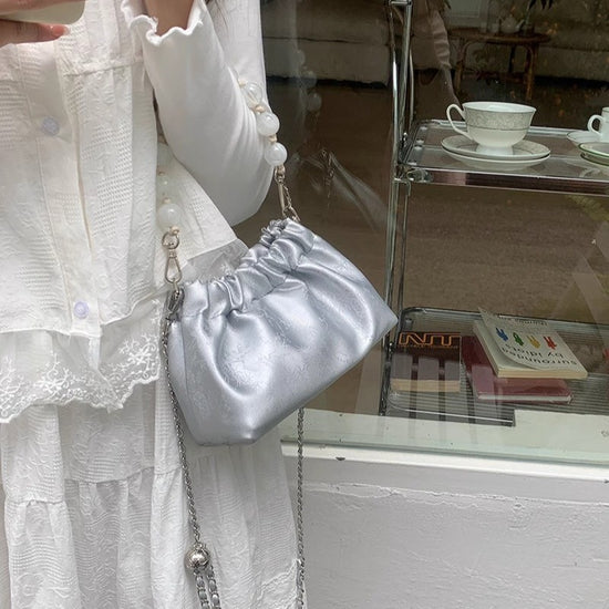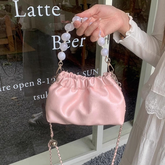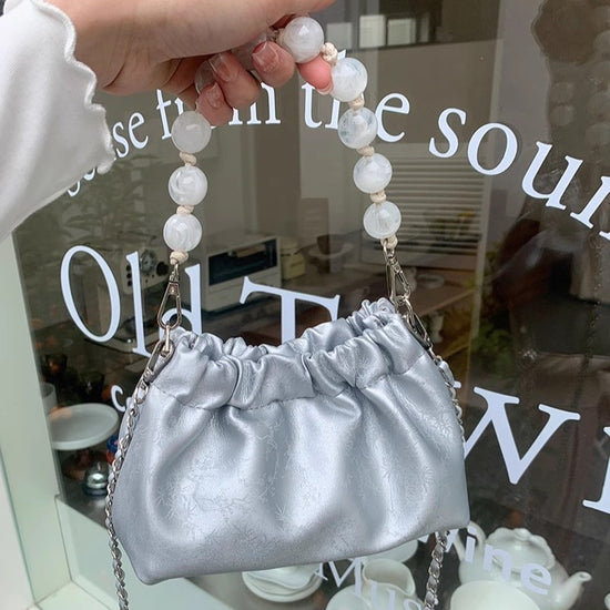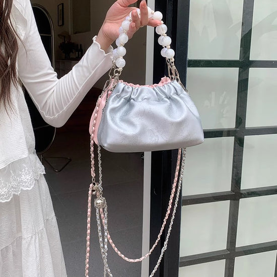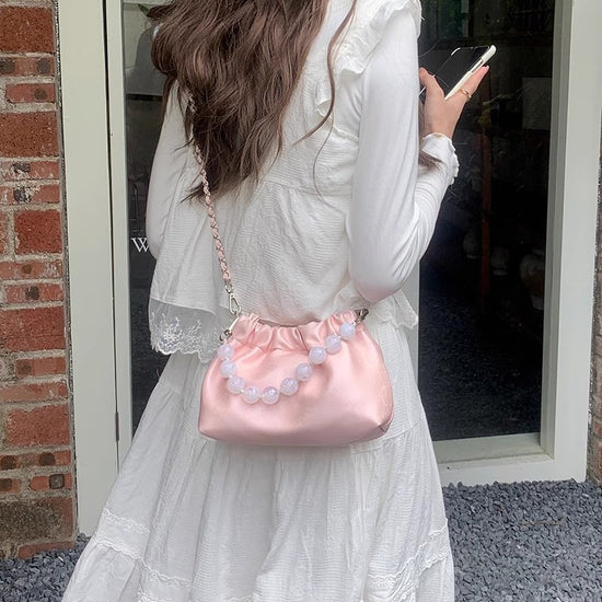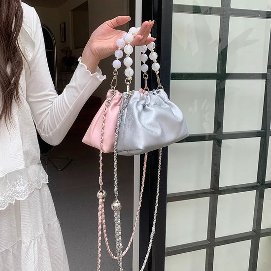 日韓流行|新中式串珠手提包包女2024新款夏季小眾設計鏈條斜挎包褶皺水桶包「9335#」24.04-3