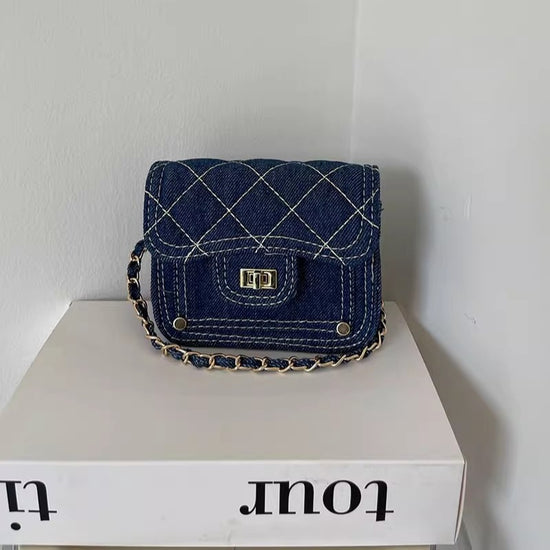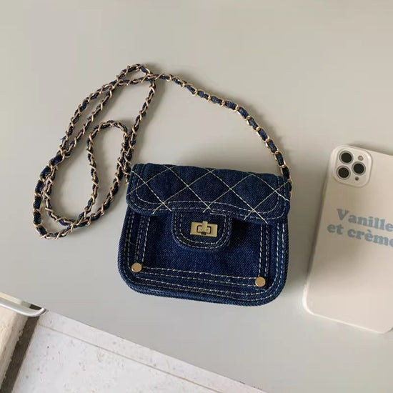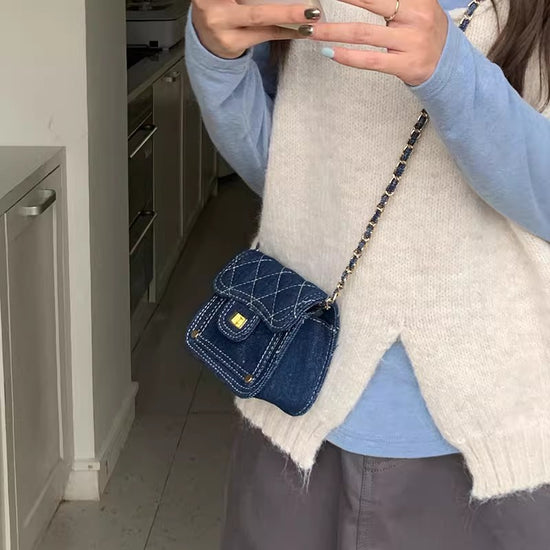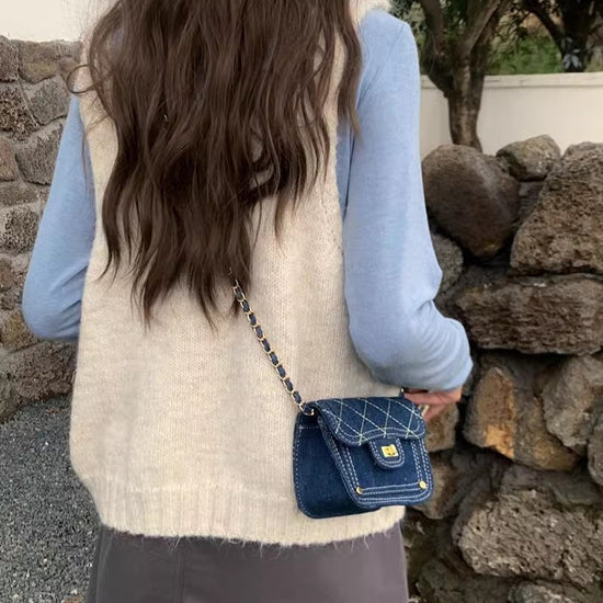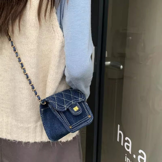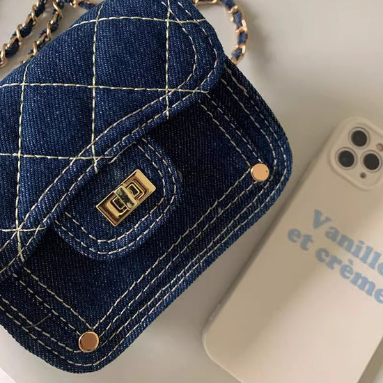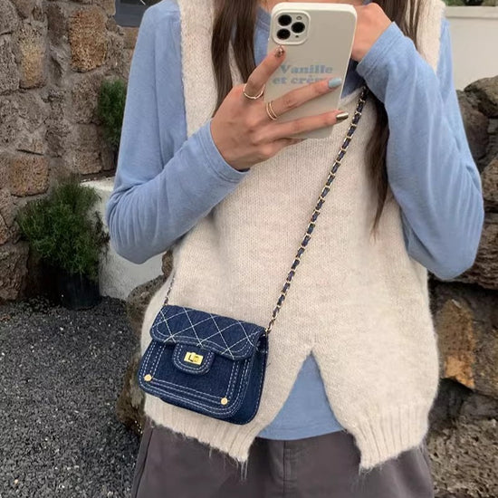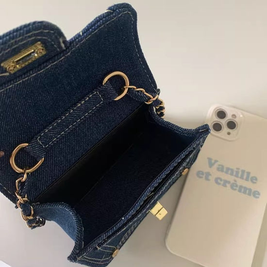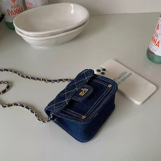日韓流行|2024新款休閒水洗牛仔布迷你耳機小包鏈條裝飾斜挎包口紅包包女「9382#」24.05-3