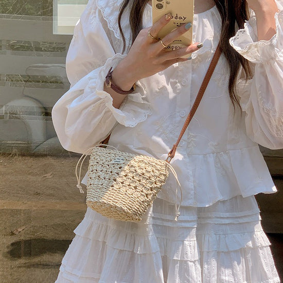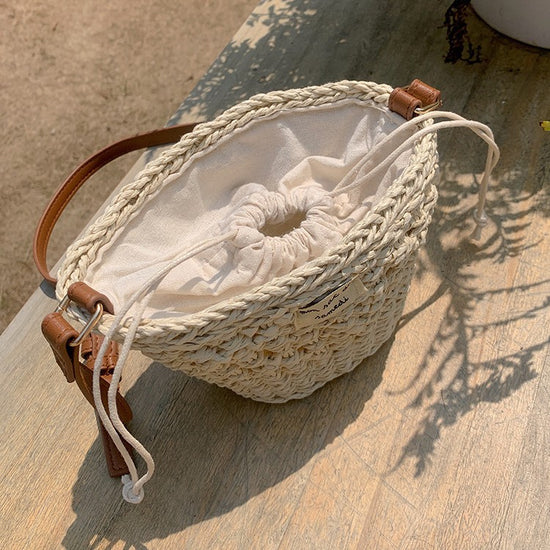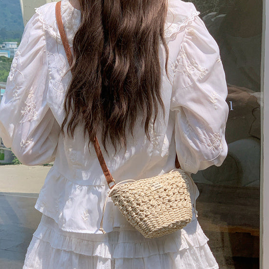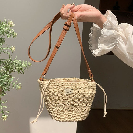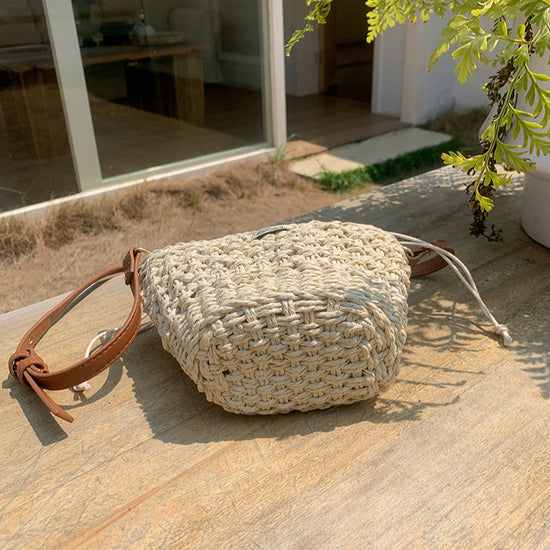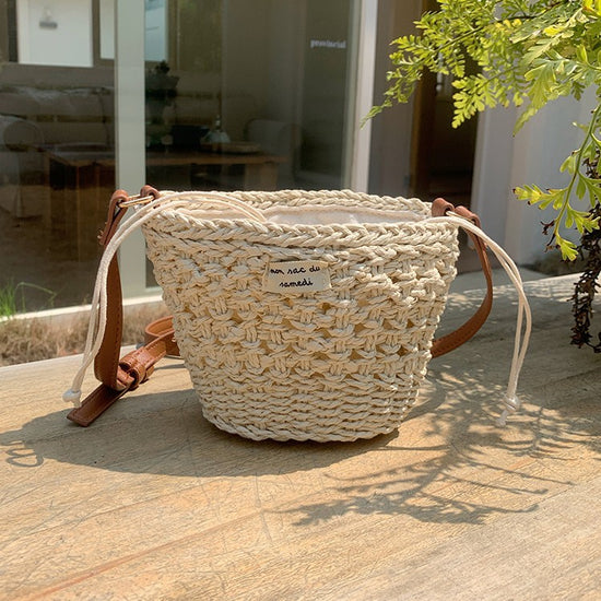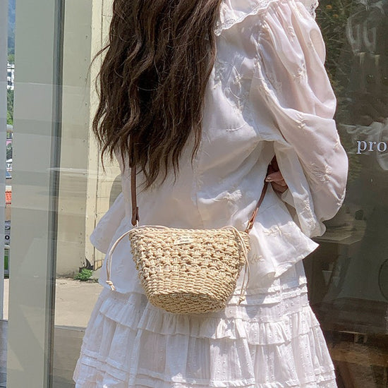 日韓流行|小眾編織包女2025夏季新款休閒草編鏤空沙灘包迷你單肩斜挎水桶包「9578#」25.04-3