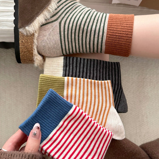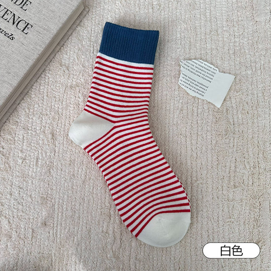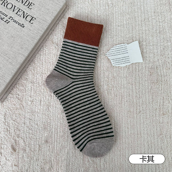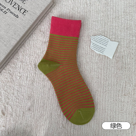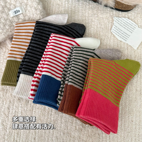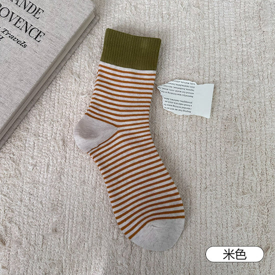 女襪|撞色復古條紋襪子女棉質吸汗透氣彈力中筒襪親膚舒適好搭堆堆襪「B24107」25.10-3