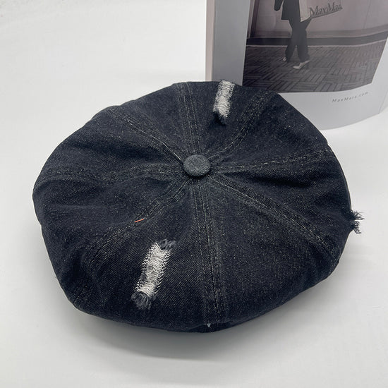 流行帽子|牛仔破洞貝雷帽女春夏季新款百搭雲朵帽復古水洗做舊顯臉小八角帽「C3680」24.02-2