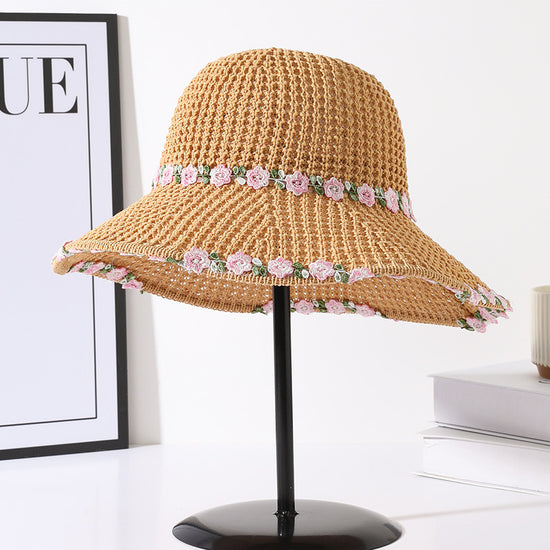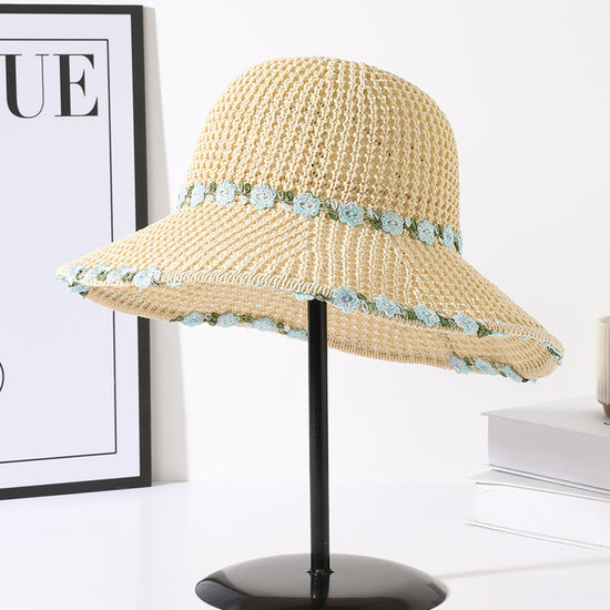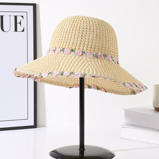 流行帽子|夏季編織草帽女海邊度假遮陽小花太陽草帽可折疊鏤空防曬漁夫帽子「C5152」25.04-1