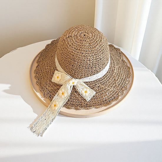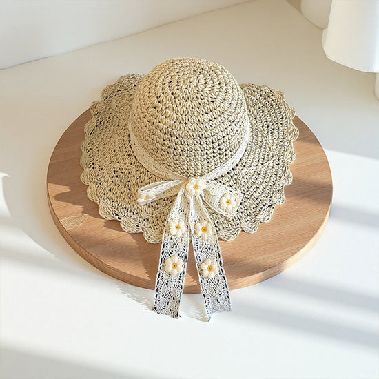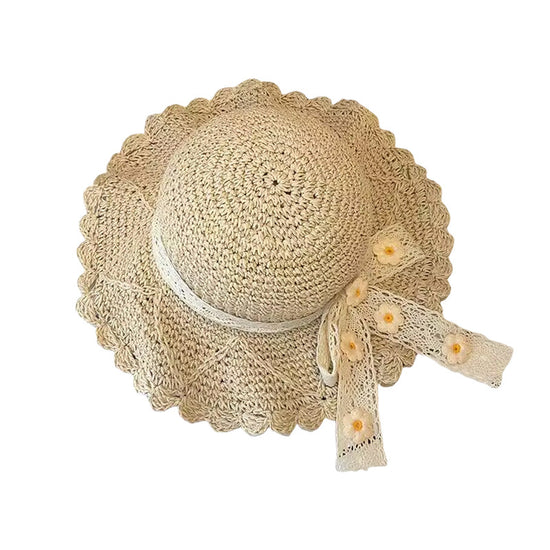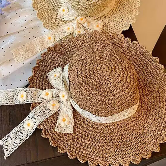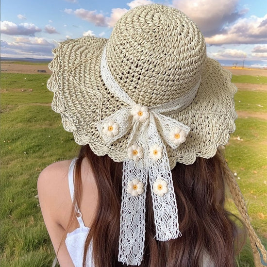 流行帽子|日系小清新帽子女花朵蕾絲蝴蝶結大檐草帽海邊度假新款遮陽防曬帽「C5325」25.06-3