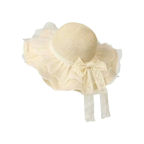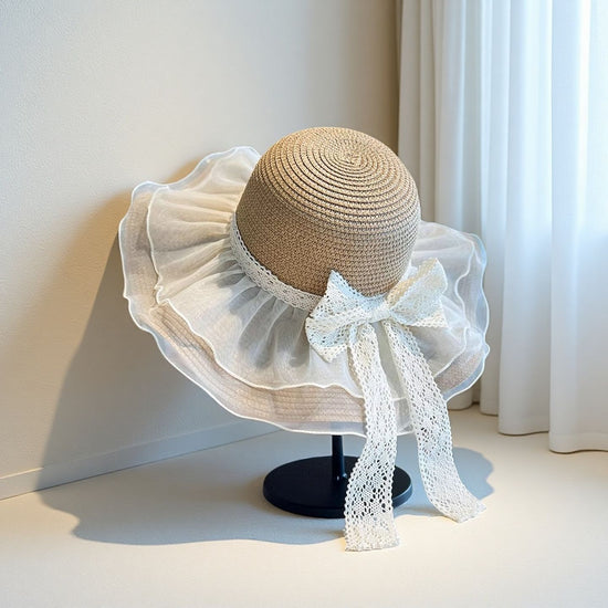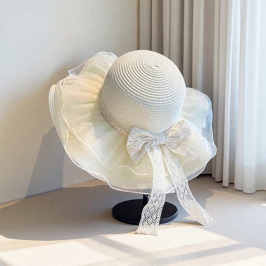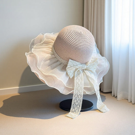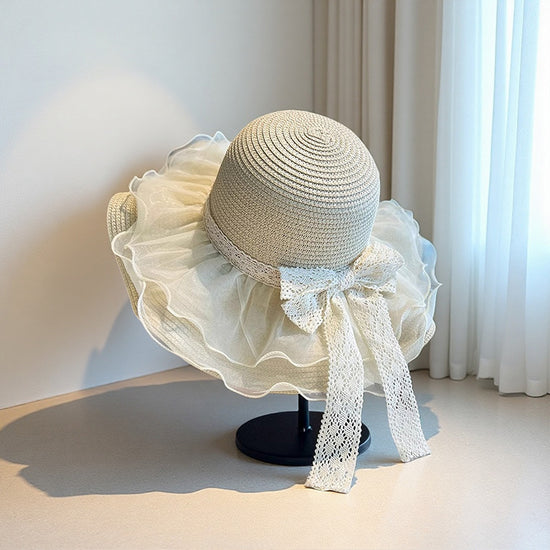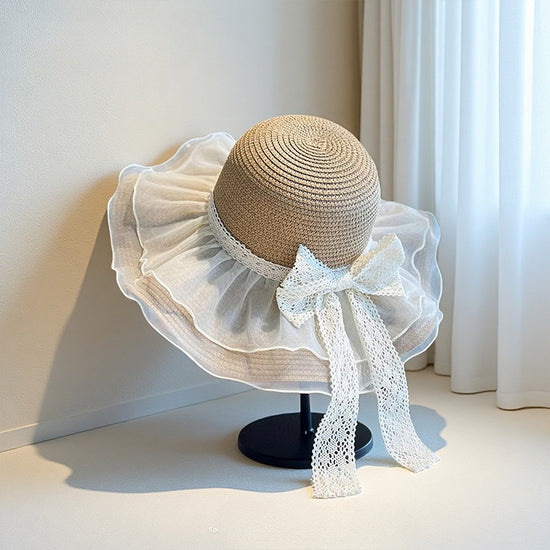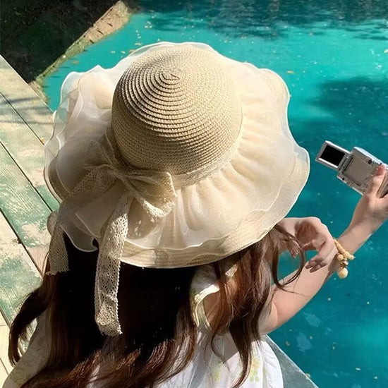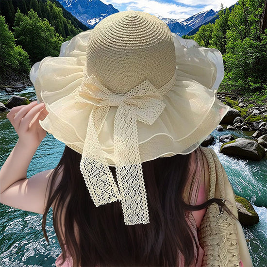 流行帽子|法式蕾絲蝴蝶結草編帽子女夏沙灘海邊遮陽帽防紫外線大檐防曬草帽「C5329」25.07-1