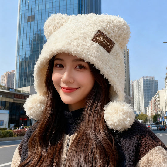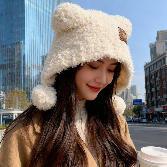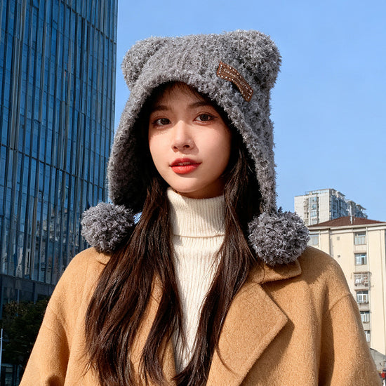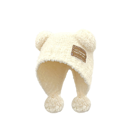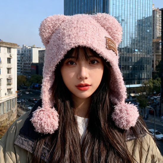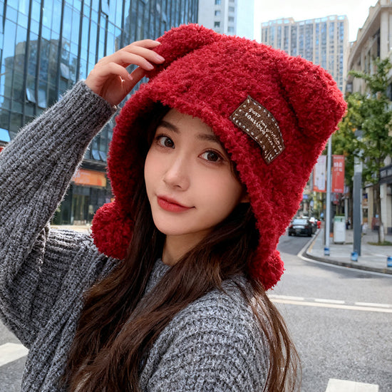 流行帽子|可愛小熊耳朵球球毛絨帽子女秋冬保暖百搭針織帽護耳防寒「C5746」25.11-1