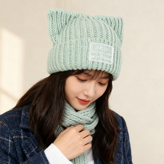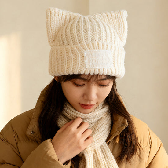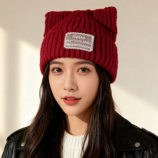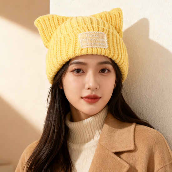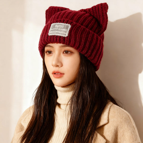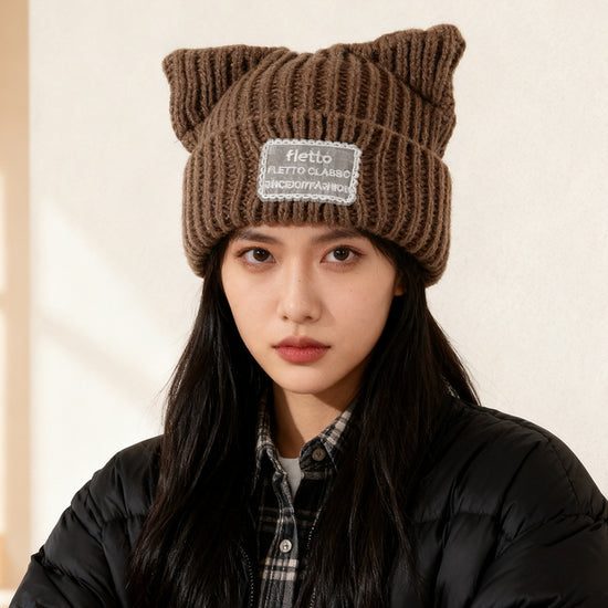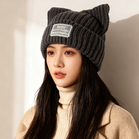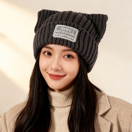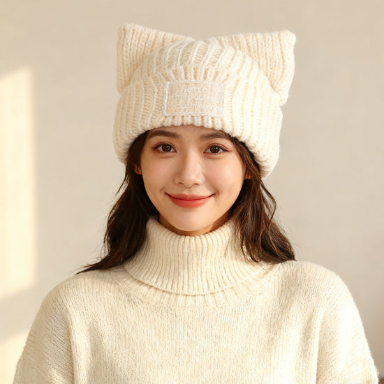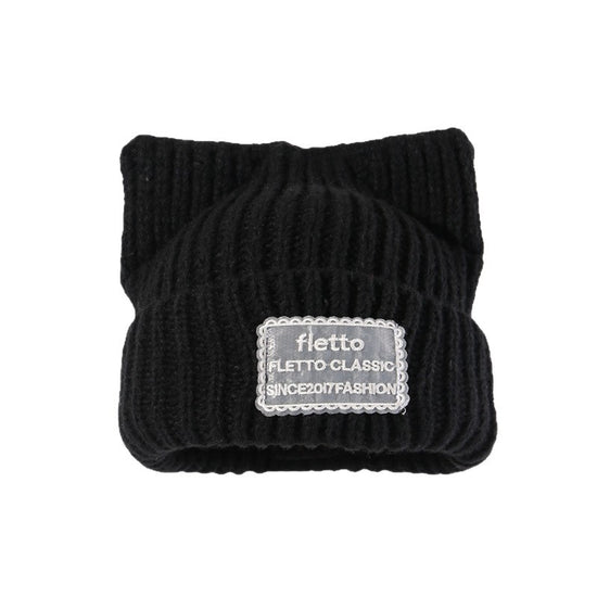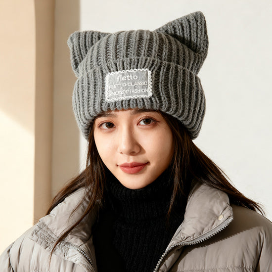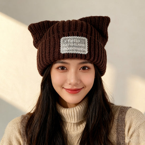 流行帽子|新款蕾絲貼布貓耳針織帽子女秋冬保暖毛線帽時尚百搭顯臉小包頭帽「C5801」25.11-2
