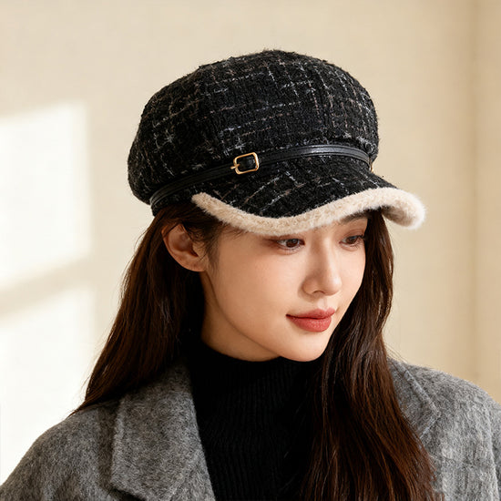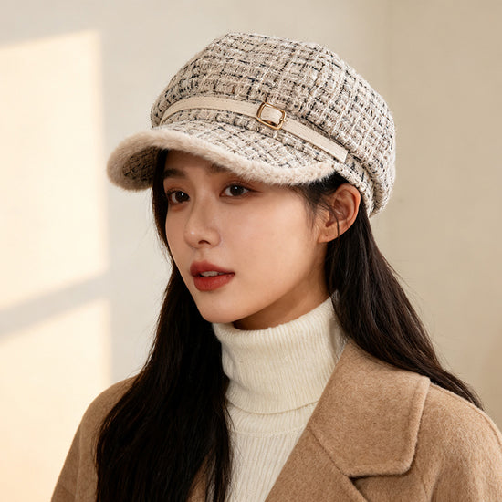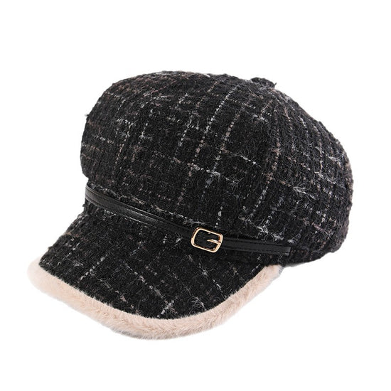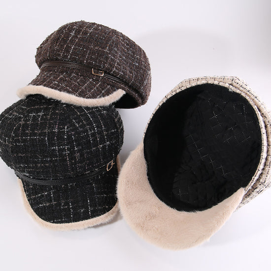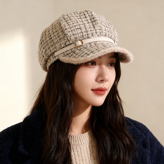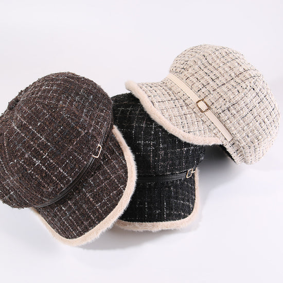 流行帽子|小香風格子毛絨帽子女秋冬保暖顯臉小八角帽大頭圍日系鴨舌貝雷帽「C5840」25.11-3