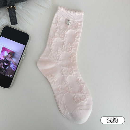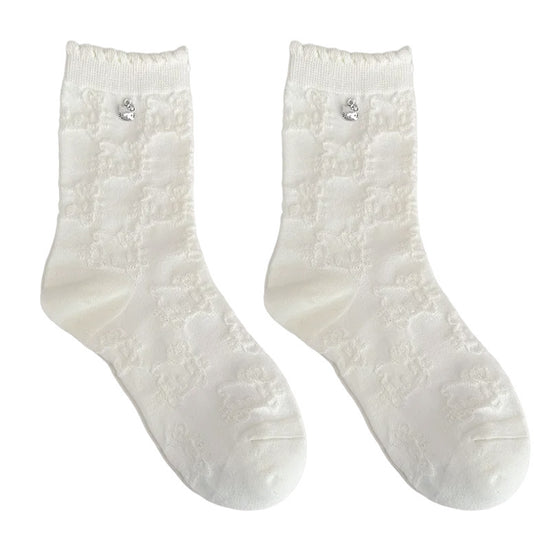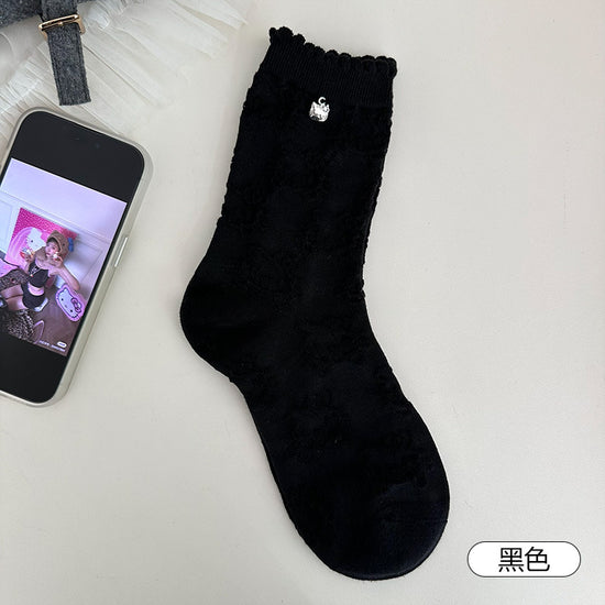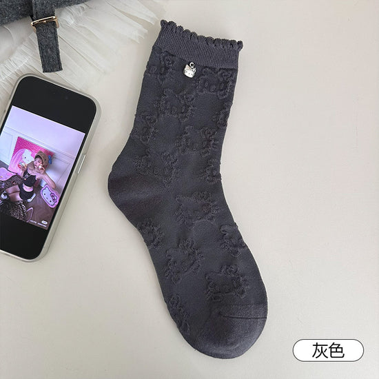 女襪|花邊襪子女暗紋貓咪萌趣好搭彈力中筒襪金屬標吸汗透氣襪子「D2536」25.10-2