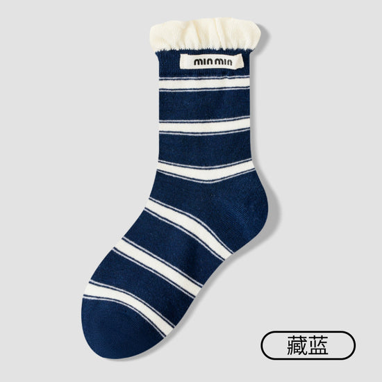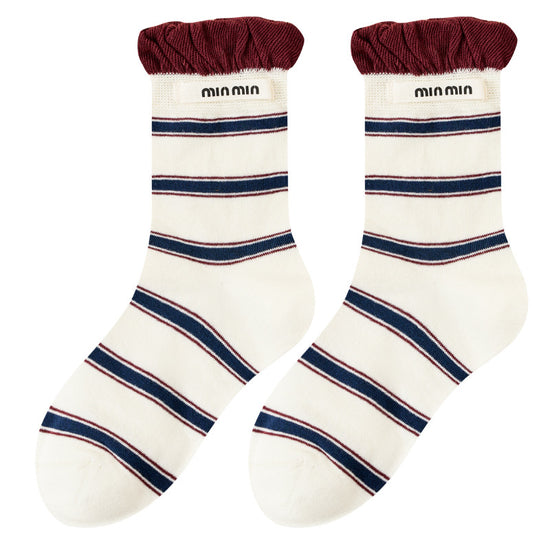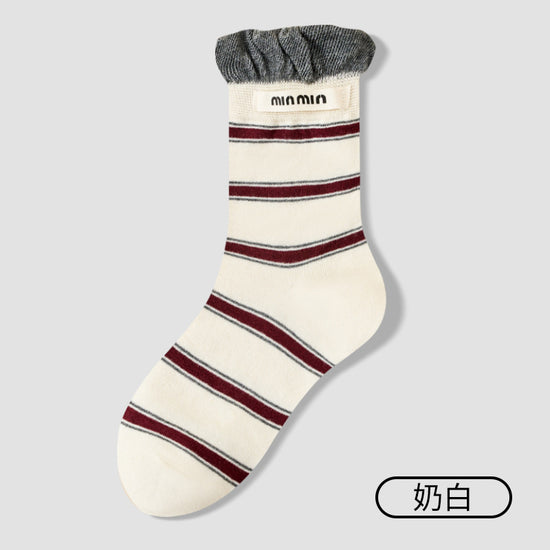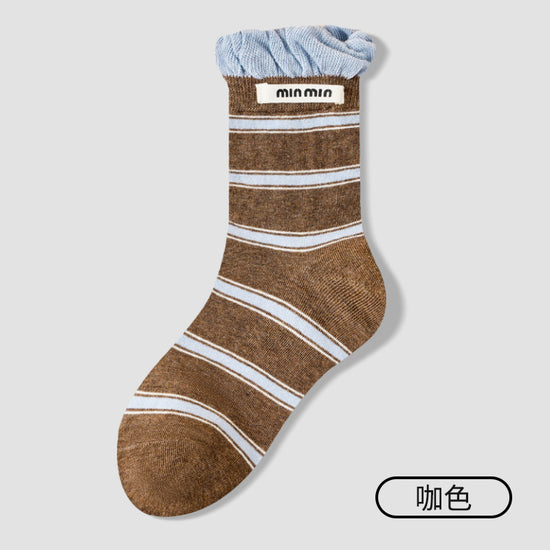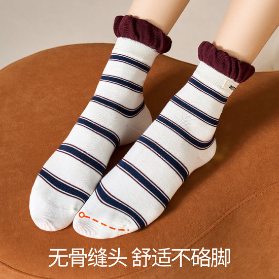 女襪|撞色條紋襪子女韓系泡泡口親膚舒適中筒襪吸汗透氣彈力無骨堆堆襪「D2543」25.10-2