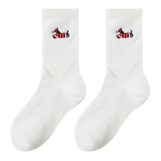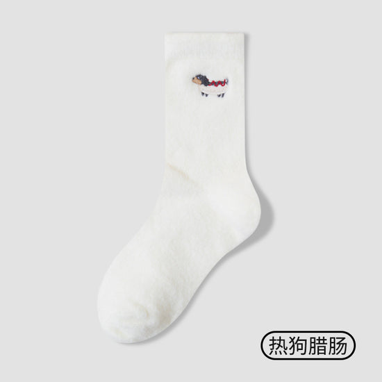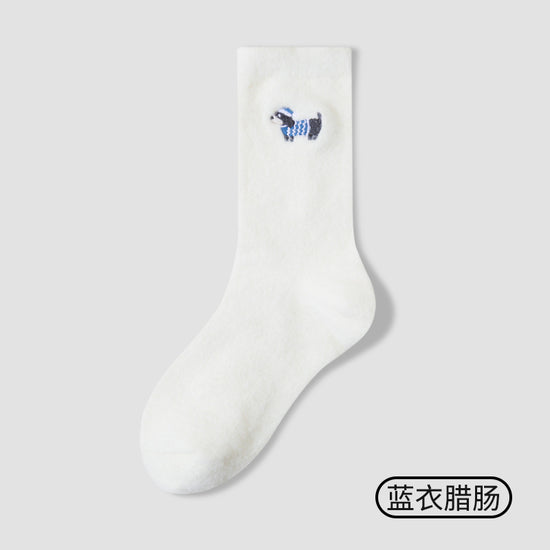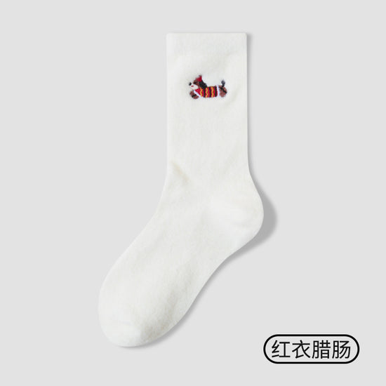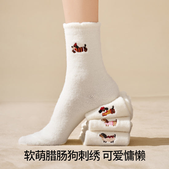 女襪|臘腸狗刺繡襪子女秋冬加厚保暖澳絨中筒襪彈力花邊親膚舒適堆堆襪「H5271」25.12-1