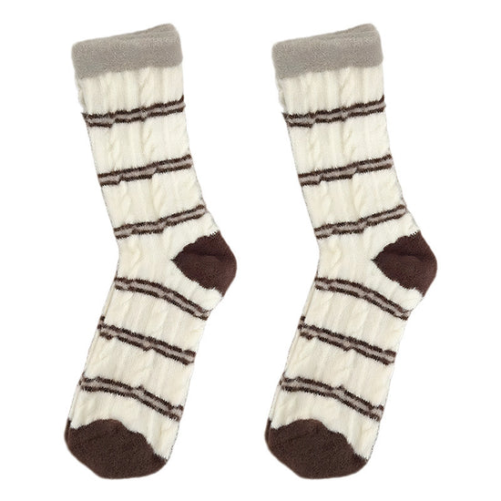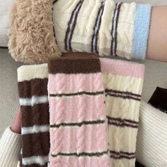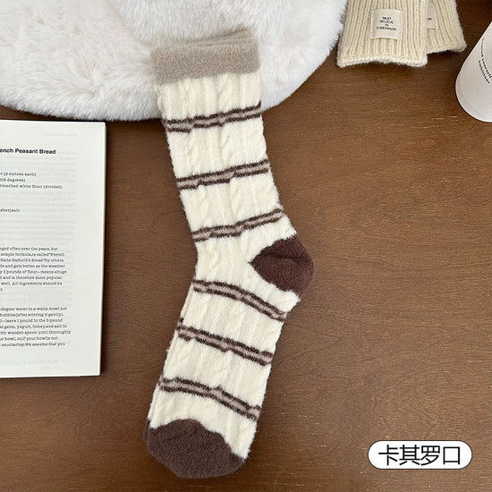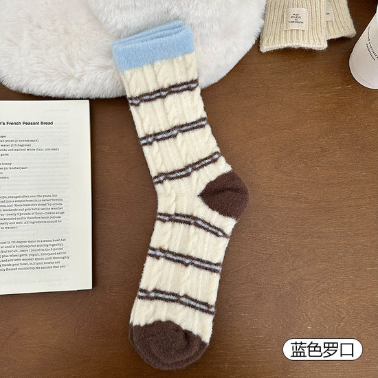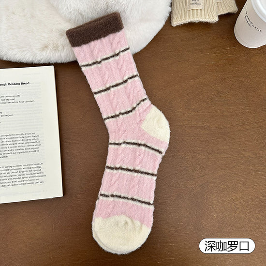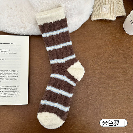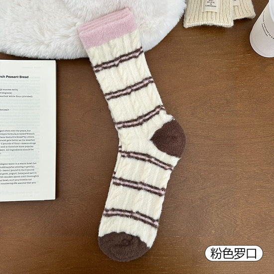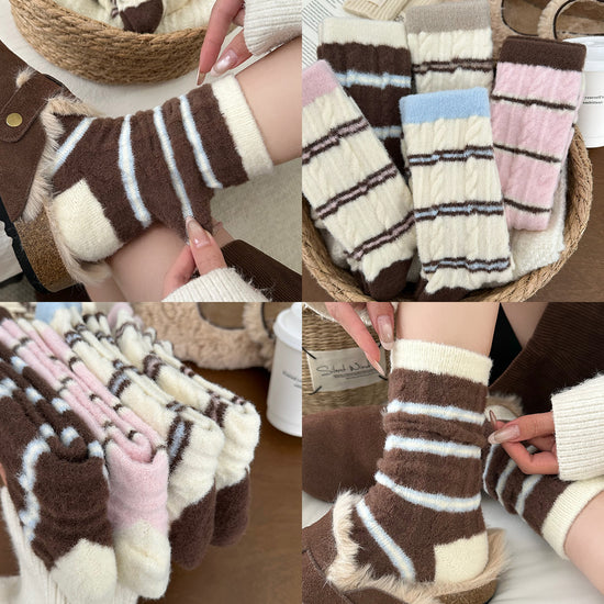 女襪|撞色條紋襪子秋冬季ins韓版加絨加厚堆堆襪蓄熱鎖溫毛絨中筒襪「H5767」25.11-2