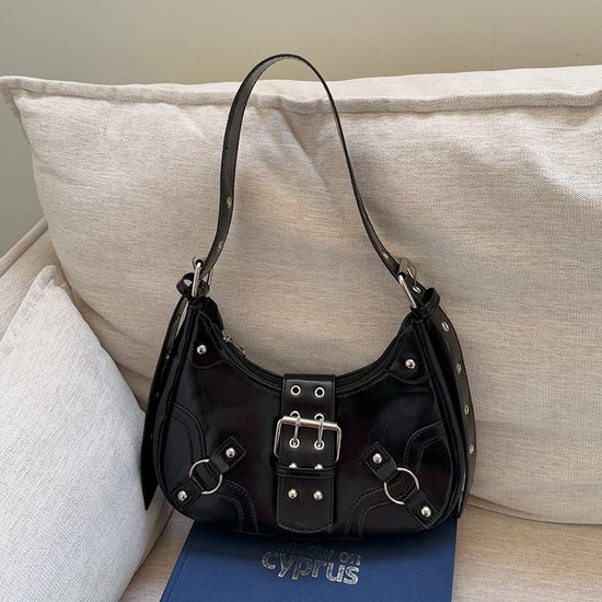 日韓流行|甜酷辣妹機車風腋下包女生2025新款百搭通勤鉚釘月牙包單肩斜挎包「J9014」25.07-3