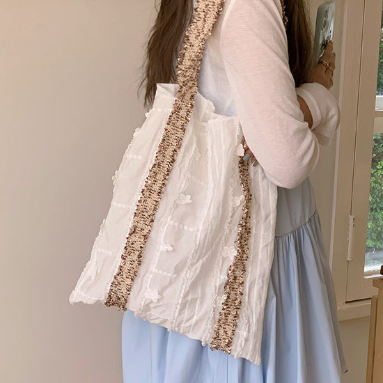 日韓流行|2025早春小眾設計花朵織帶肌理感夏季帆布大容量單肩包便攜式包袋「M8974」25.04-5