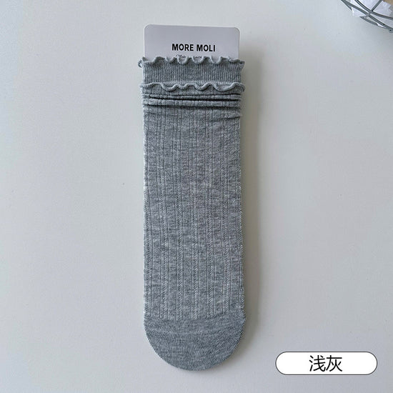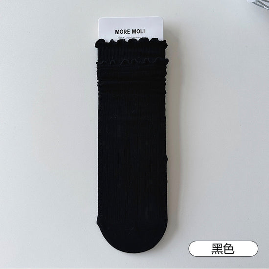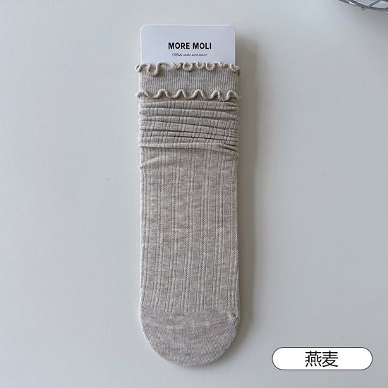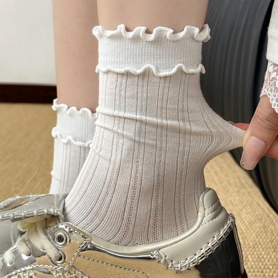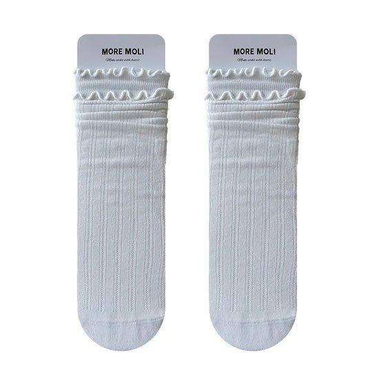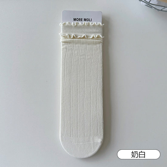 女襪|白色雙木耳邊襪子女miu系竪條顯瘦彈力中筒襪棉質吸汗防臭堆堆襪「NY2626」25.07-4