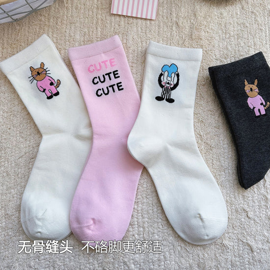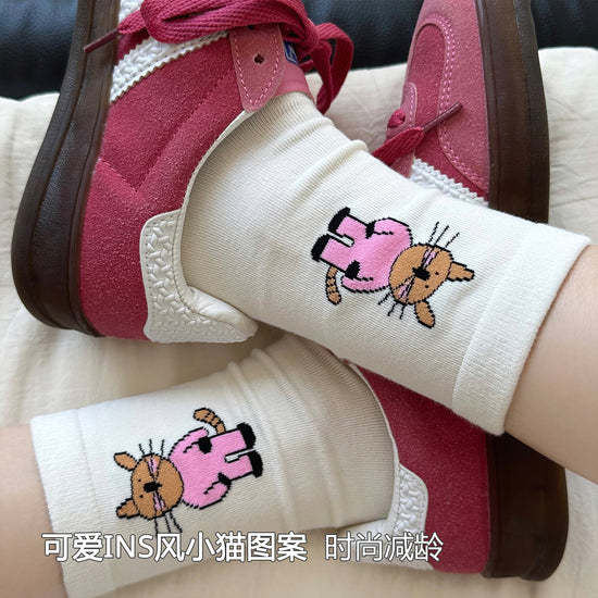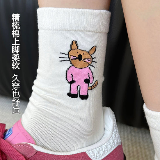 女襪|襪子女士秋冬日系插畫卡通貓咪中筒襪彈力無骨親膚舒適堆堆襪「WN2511」25.10-1